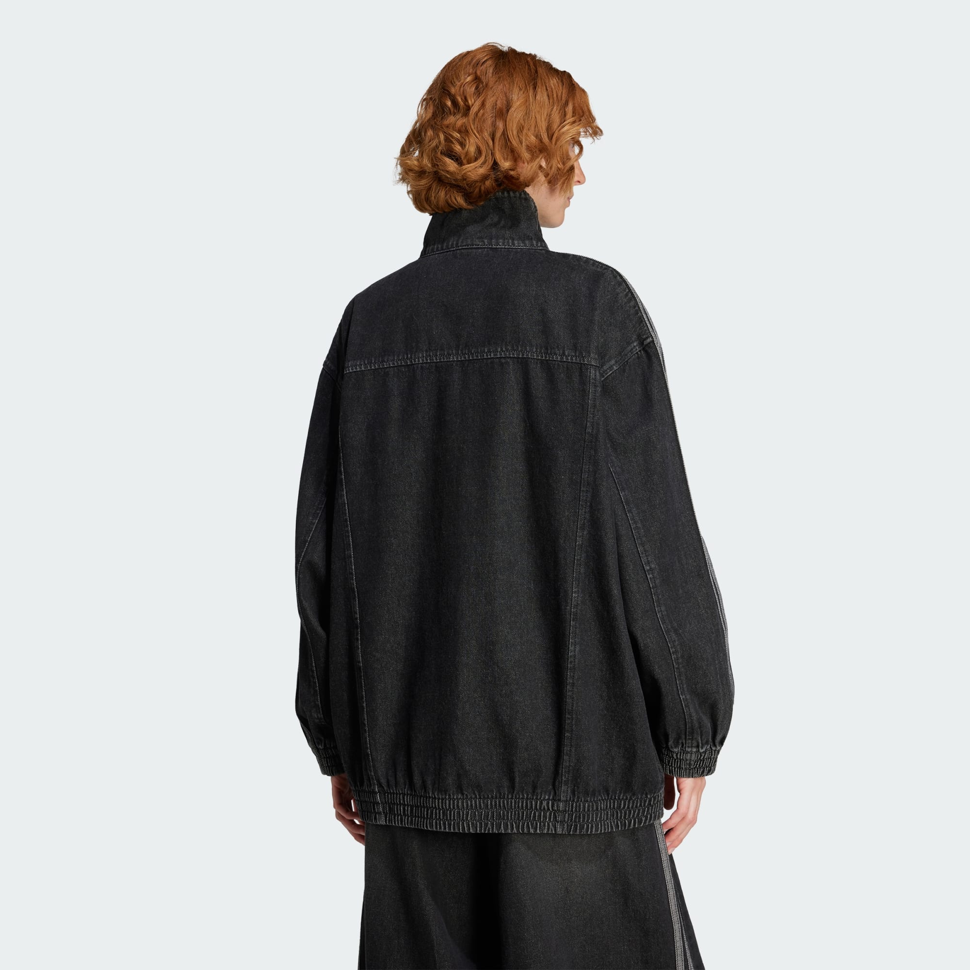 An oversized denim track top inspired by casual '90s fashion.