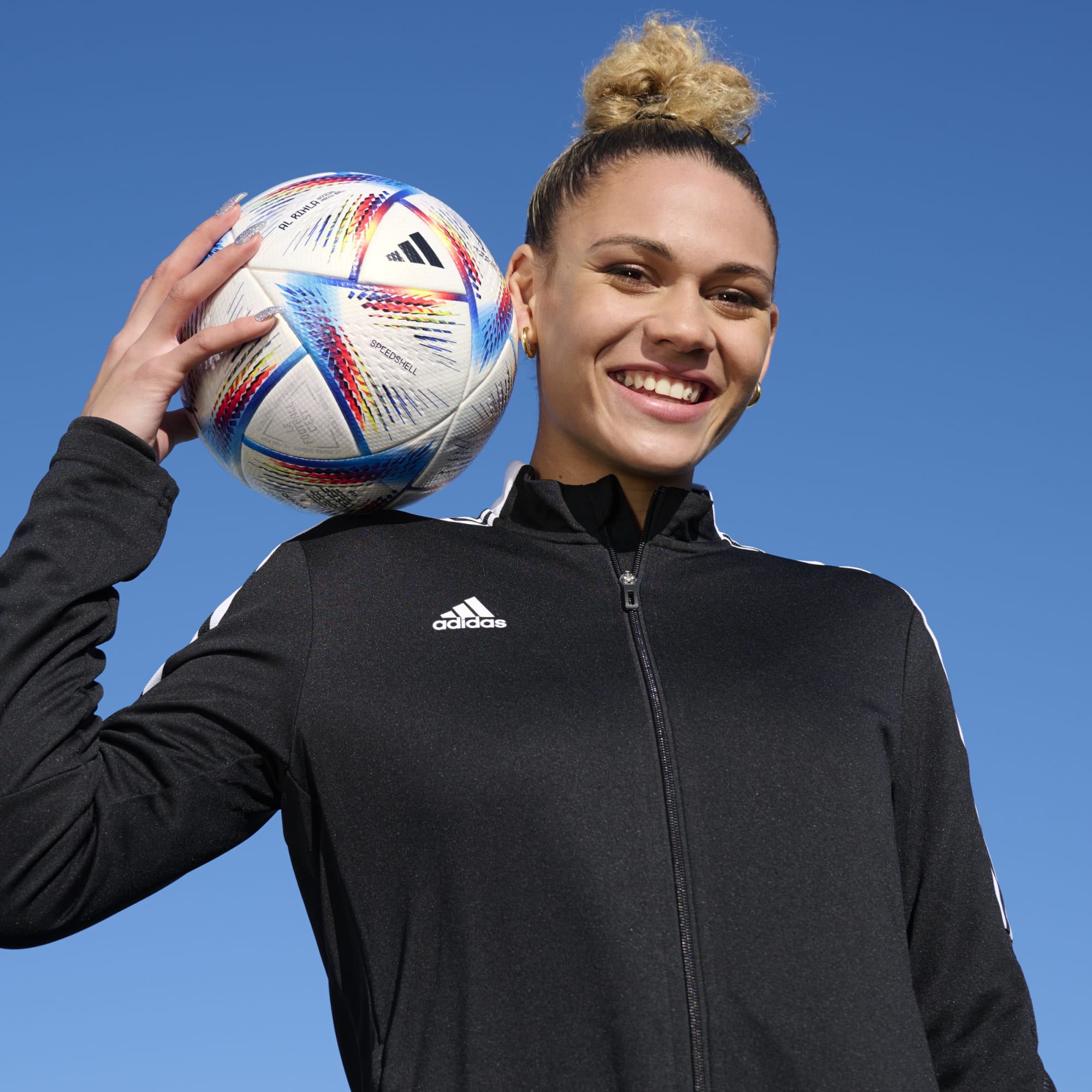 Al Rihla means the Journey, the ball is just the beginning. The rest of your football journey is yet to be written. The official match ball of FIFA World Cup Qatar 2022™, this seamless adidas Al Rihla Pro ball takes precision to new heights. Its dhow-inspired Speedshell panel shape combines with texturing and diamond debossing to enhance swerve and accuracy. The vibrant graphics shimmer under a pearlescent finish.