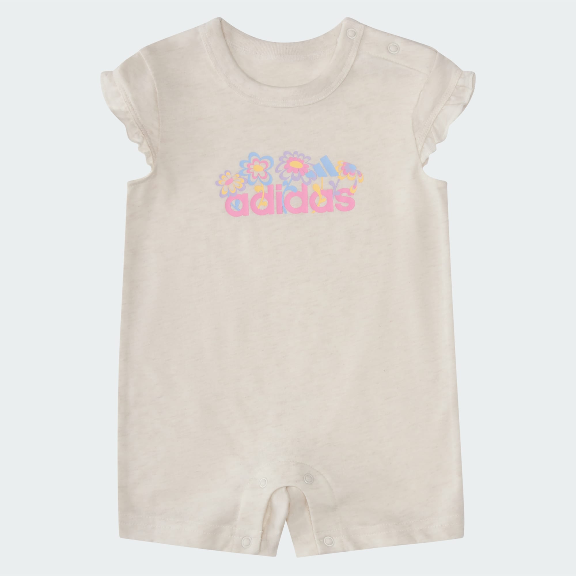 Introducing the adidas HTR GFX Cap Sleeve Romper, designed for exploring brand-new worlds in comfort. Crafted with smooth single jersey, it will offer a gentle touch to your baby's delicate skin while providing durability for all their adventures. With the convenience of snap closures on the shoulder and legs, it makes changes a breeze, leaving more time for fun. The regular fit, meanwhile, strikes a balance between snug and loose, allowing for freedom of movement as your little one takes those first steps. A bold graphic brings eye-catching style, while those ruffled cap sleeves add an adorable detail. Plus, this romper is machine washable so, whatever spills and scrapes it encounters, it won’t be out of the game for long.