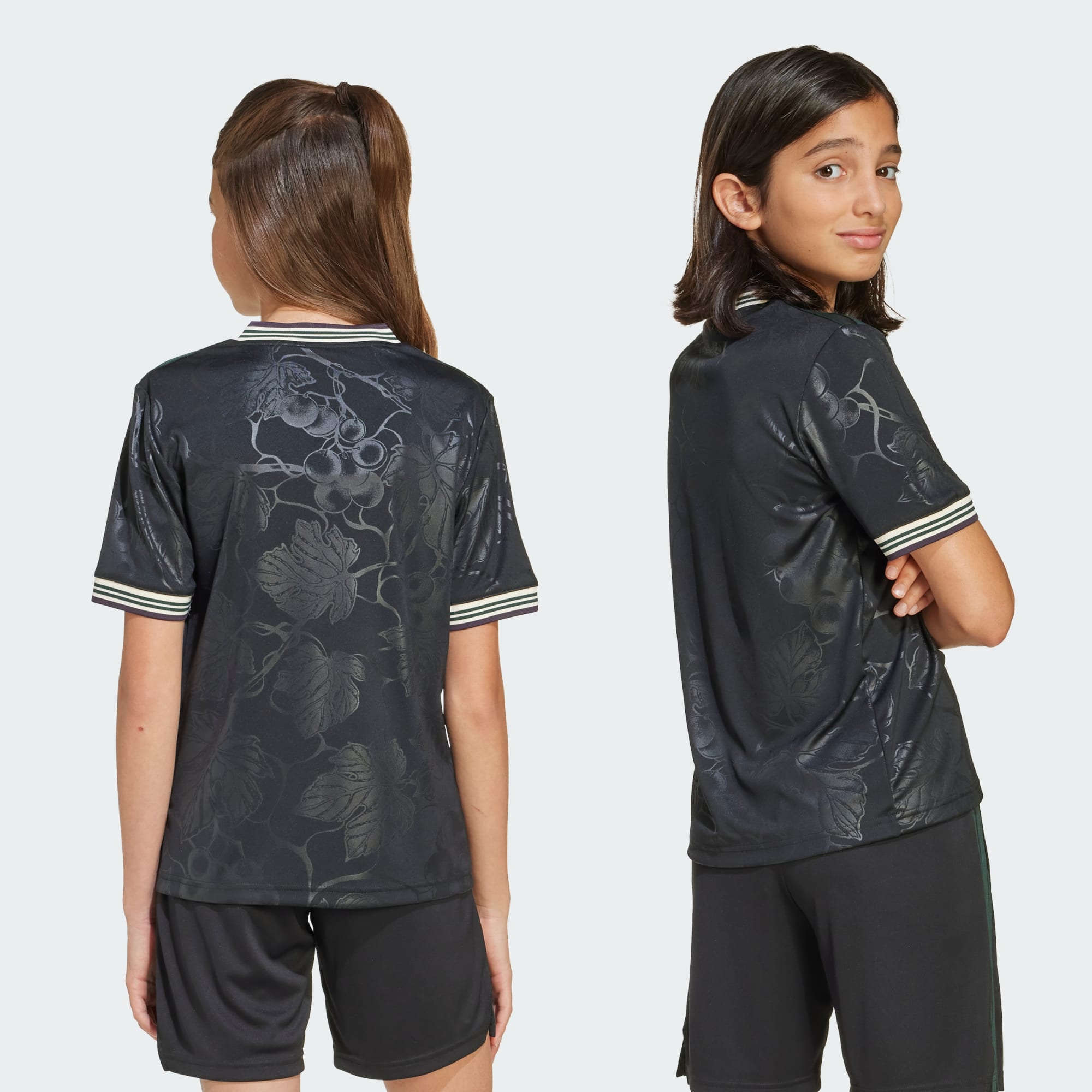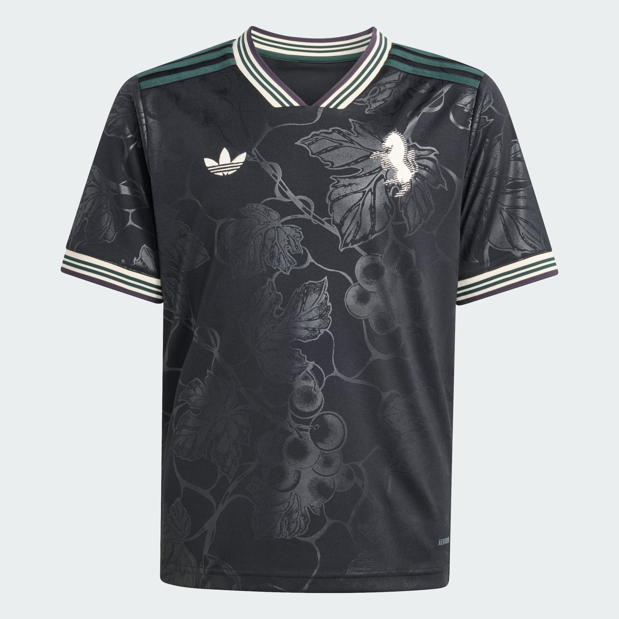 Raise a glass to your soccer heroes in a juniors' Juventus jersey that pays tribute to Piedmont's wine-making tradition. Standing out from black colors, an embroidered adidas Trefoil and classic club badge join subtle, vineyard-inspired graphics to produce an understated, elegant look. Created to keep fans comfortable and relaxed, this shirt features soft fabric and moisture-managing AEROREADY.