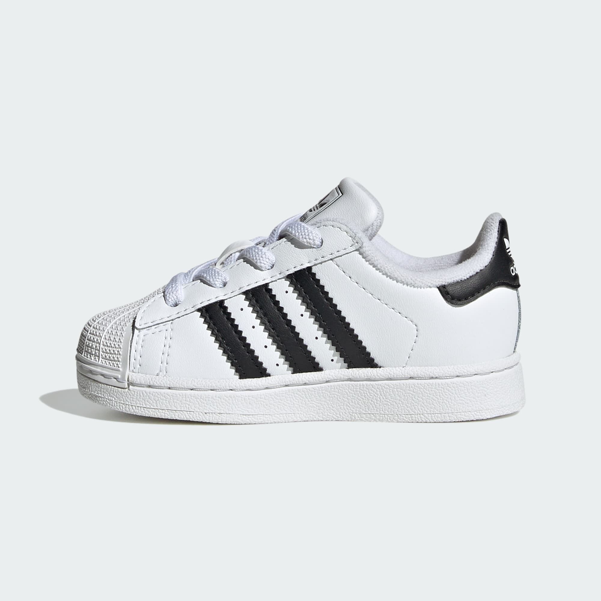 For over 50 years, adidas Superstar shoes have been a legend. They've been adopted by countless creators, athletes and musicians and have become an icon of self-expression. This toddlers' pair is made for little feet, with elastic laces that provide a secure fit for babies on the go. They come with the same smooth leather upper, rubber shell toe and serrated 3-Stripes that made the original a style icon.
