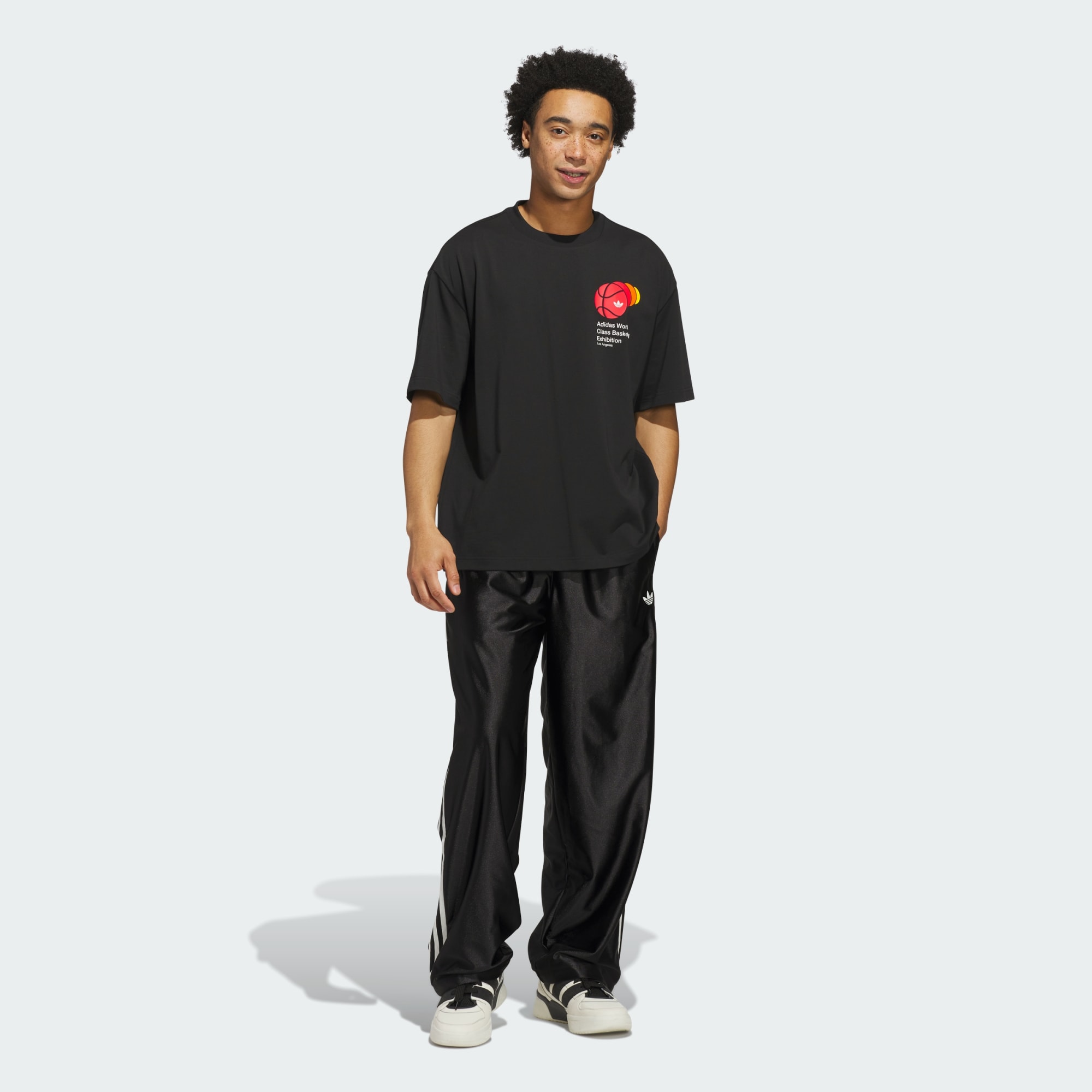 A loose-cut crewneck tee with basketball graphics.