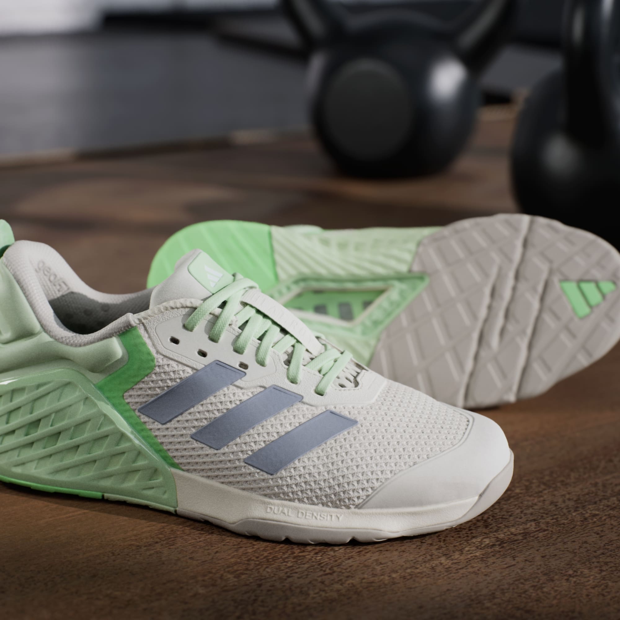 L'adidas Dropset est conçue avec deux couches de mousse. La mousse plus rigide de la semelle intermédiaire au talon assure une stabilité supérieure, et la mousse plus souple à l'avant-pied offre une flexibilité et un confort exceptionnels. Combinées, elles offrent contrôle et stabilité pour réaliser tes entraînements les plus intenses en toute confiance. Une chaussure pour le renforcement musculaire doit t'apporter un maximum de confort pour éviter toute distraction et une stabilité optimale pour effectuer correctement tes soulevés. La semelle intermédiaire double densité de l'adidas Dropset coche ces deux cases, pour t'aider à travailler ta force.