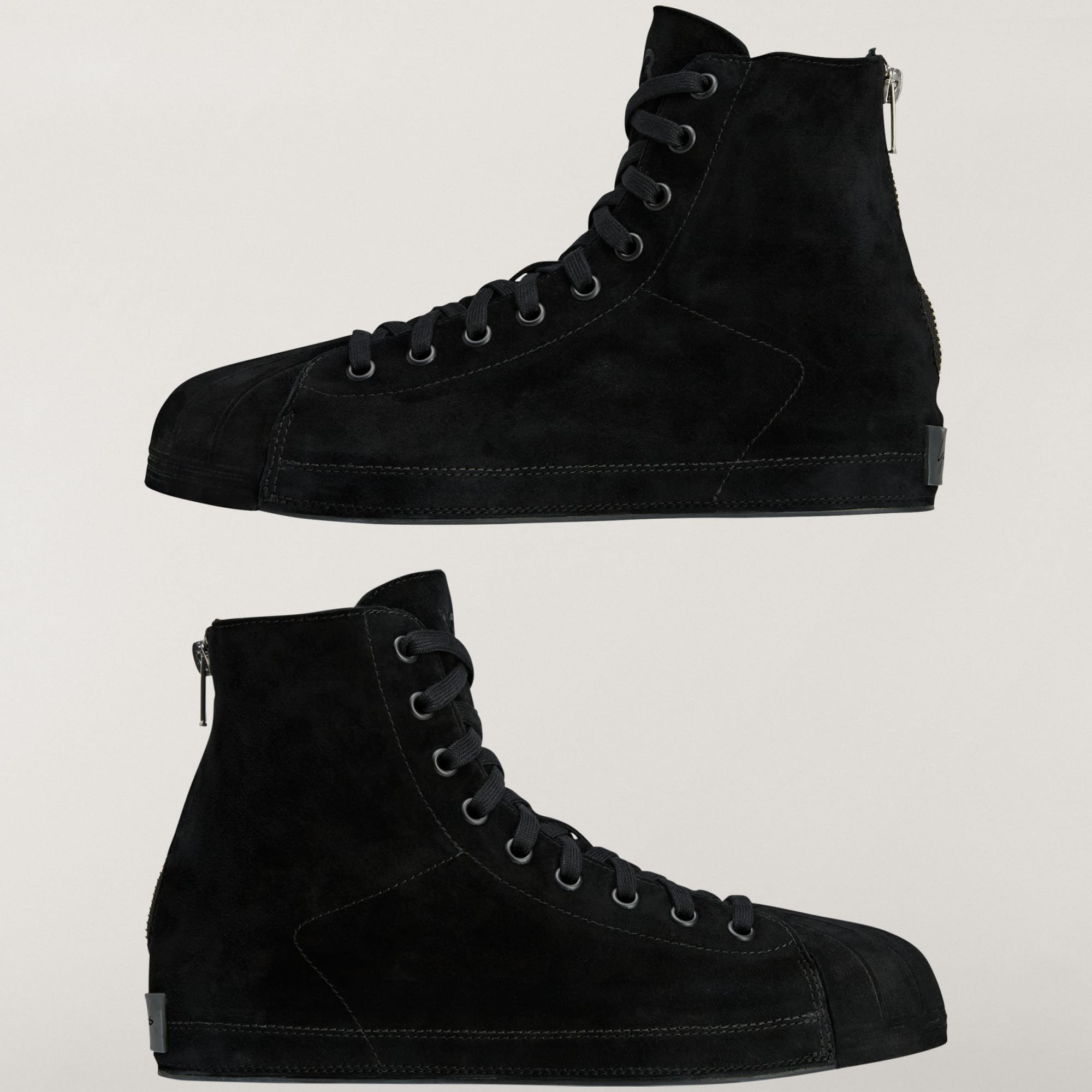 Cette chaussure célèbre la rencontre de deux univers : celui des modèles adidas Superstar et celui du modèle Nizza. Basé sur la même construction de semelle intermédiaire avant-gardiste que la Y-3 NIZZA, ce modèle montant est réalisé avec une tige en suède qui s'étend jusqu'à la semelle extérieure et qui comprend le shell-toe emblématique de la chaussure adidas Superstar. Il en résulte un look distinctif, mais extrêmement minimaliste. En plus de cela, la chaussure présente une fermeture zippée au talon pour l’enfiler facilement. Elle est ornée d'un logo Y-3 sur la languette et d'une signature de Yohji Yamamoto sur le patch au talon.
